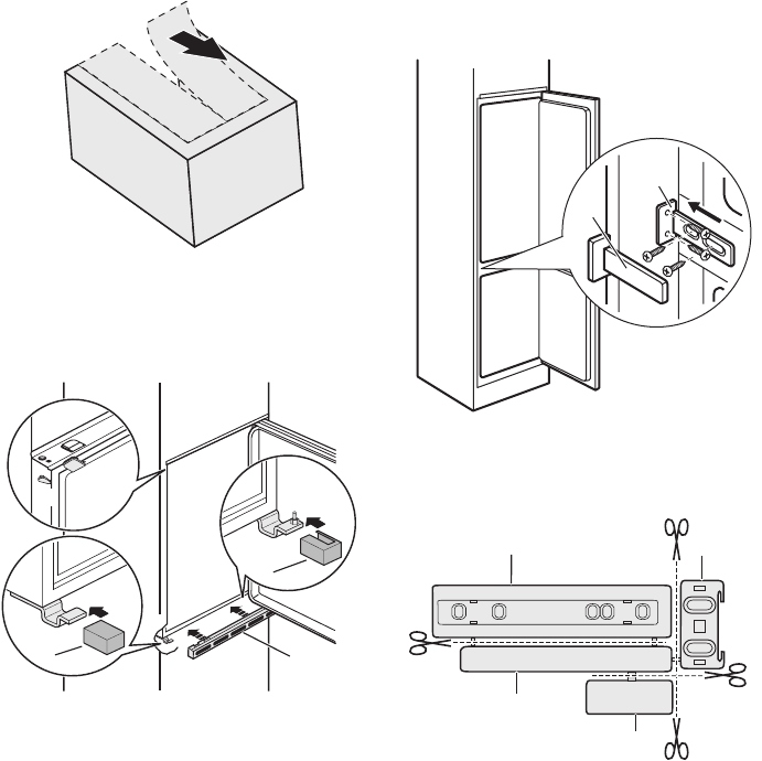 Fije las tapas (E) a la bisagra.